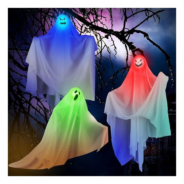 3pcs Halloween Decorations Lighted White Ghost LED Lights Hanging Lighted Ghost Horror Decor Door Hanging Haunted House Halloween Party Scene Layout Props