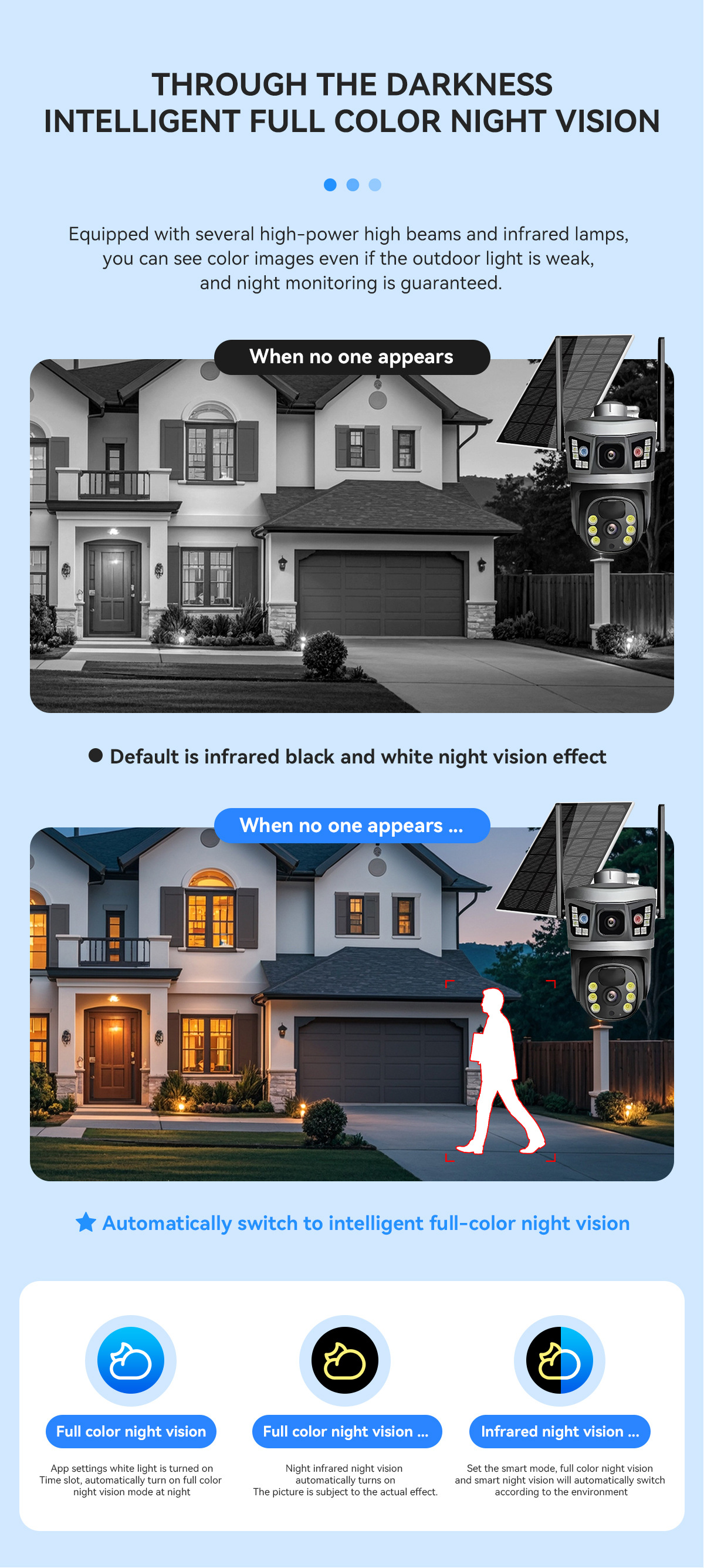 Active Deterrence (Red & Blue Light Alert): When an intruder is detected, the camera triggers a flashing red and blue siren light—the same colors as emergency vehicles—to effectively scare off unwanted visitors.
